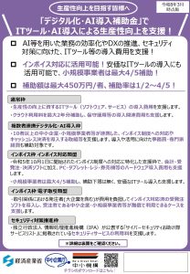デジタル化・AI導入補助金は、中小企業・小規模事業者等の労働生産性の向上を目的として、業務効率化やDX等に向けた ITツール(ソフトウェア、サービス等)の導入を支援する補助金です。 ◎公募期間(第1次):令和8年3月30日(月)~5⽉12⽇(火) <お問い合わせ> |