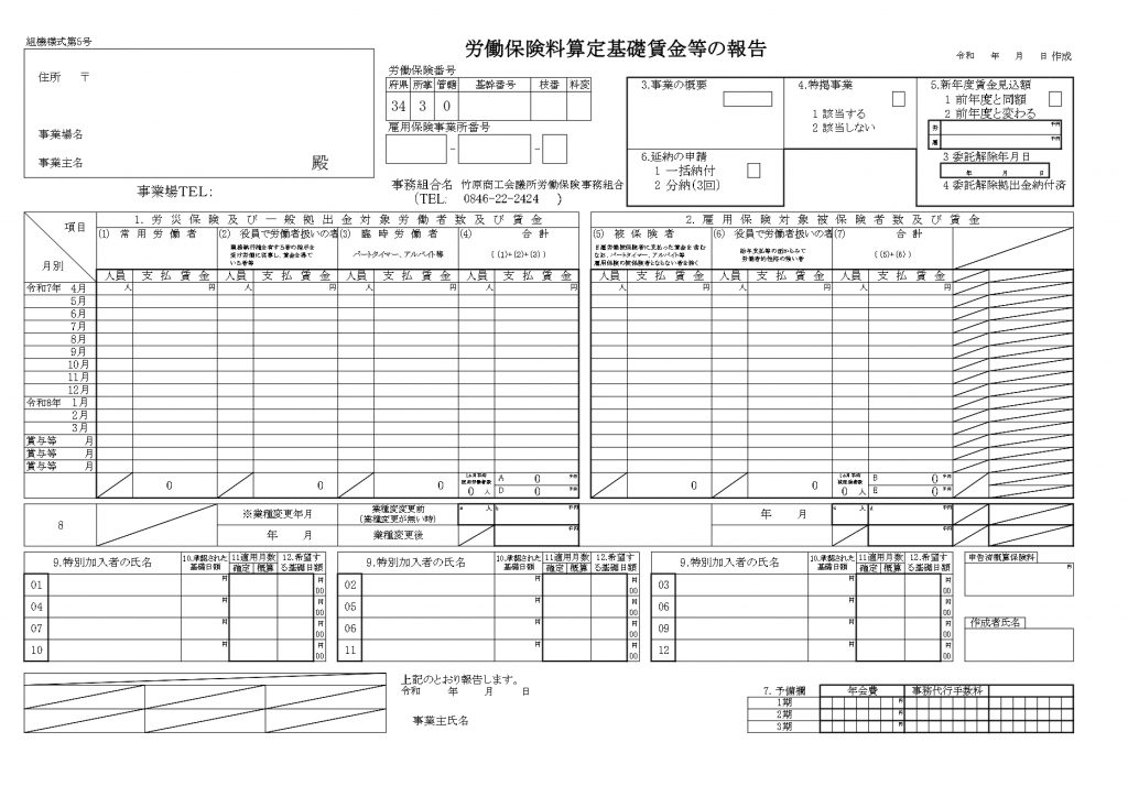 【様式第5号】労働保険料算定基礎賃金等の報告