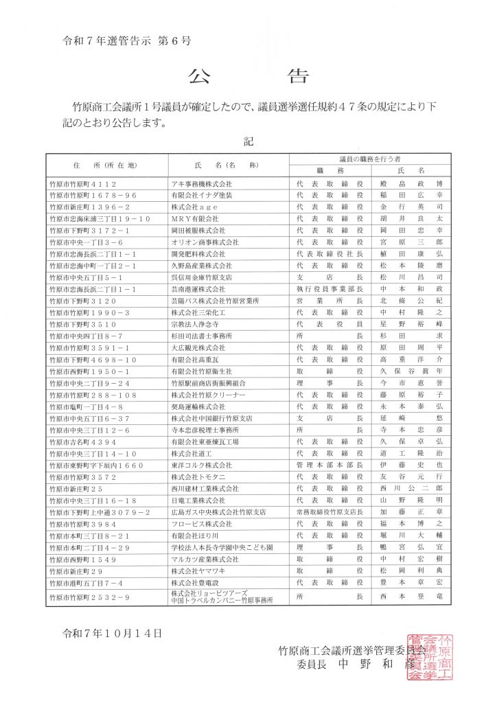 1号議員当選確定の公告(令和7年選管告示 第6号)