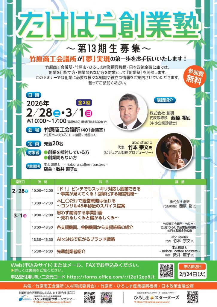 たけはら創業塾(第13期生)受講生大募集!!